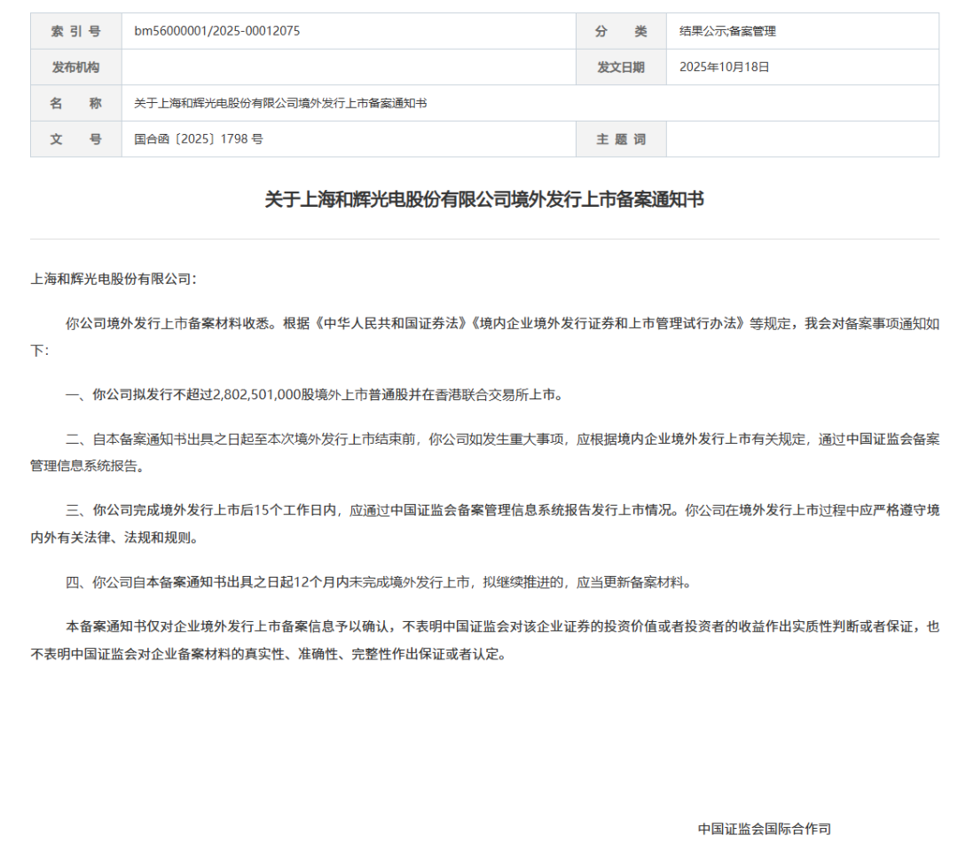 10月18日,中国证监会国际合作司发布《关于上海和辉光电股份(600184)有限公司境外发行上市备案通知书》。和辉光电拟发行不超过2,802,501,000股境外上市普通股并在香港联合交易所上市。